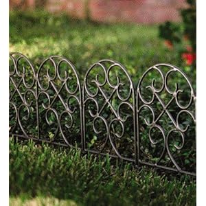 Wrought iron edging is a pretty and practical addition to your garden or beds. Easy-locking ring system allows for flexibility around curves and corners. Durable powder-coat finish. Scroll set includes six 18-1/2"L x 18"H sections and two 9-1/2"L x 18"H sections.